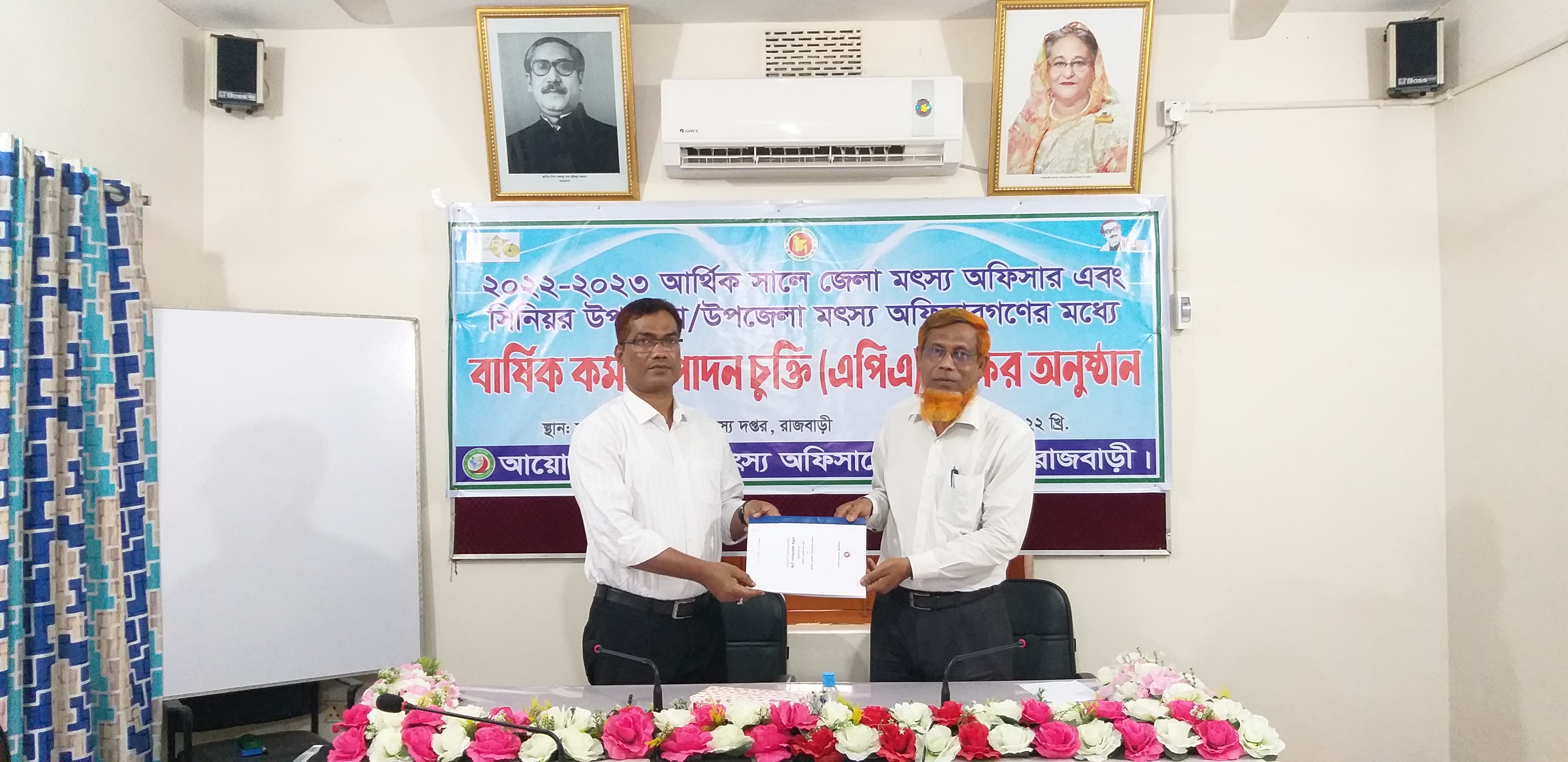 জেলা মৎস্য কর্মকর্তা, রাজবাড়ী এবং উপজেলা মৎস্য কর্মকর্তা, কালুখালী, রাজবাড়ী এর মধ্যে ২০২২-২০২৩ অর্থবছরের বার্ষিক কর্মসম্পাদন চুক্তি স্বাক্ষর করা হয়েছে।